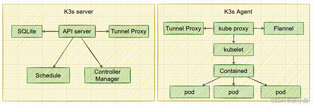 除了以上标准的部署解决方案,社区还提供了单机模式部署的 K3s 集群模式。把核心组件直接绑定为一个单体二进制文件,这样的好处就是这个系统进程只有一个,非常容易管理和恢复集群。在纯物理机环境,使用这种单点集群架构来部署应用,我们可以通过冗余部署多套集群的方式来支持应用的高可用和容灾。下图就是 K3s 的具体架构图: