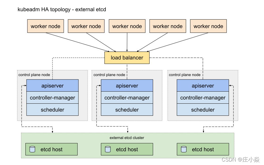 接下来我们重新理解 etcd 集群的架构。根据 Kubernetes 官方文档的参考资料介绍,通常按照 etcd 集群的拓扑模型可以分为两类生产级别的 Kubernetes 集群。