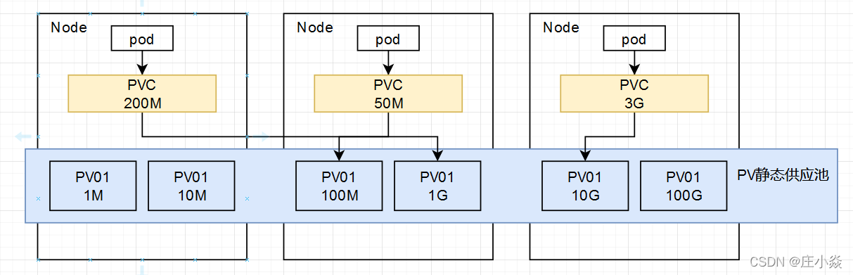 PVC:持久卷申明(Persistent Volume Claim),申明需要使用的持久卷规格(表示持久卷申请)