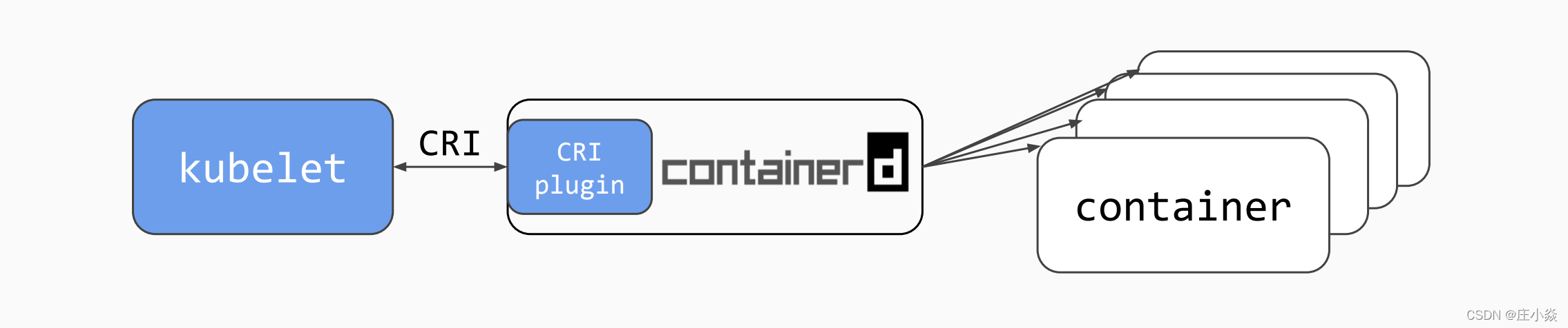 - runc,运行单个容器的容器运行时进程,遵循 OCI(开放容器标准)。