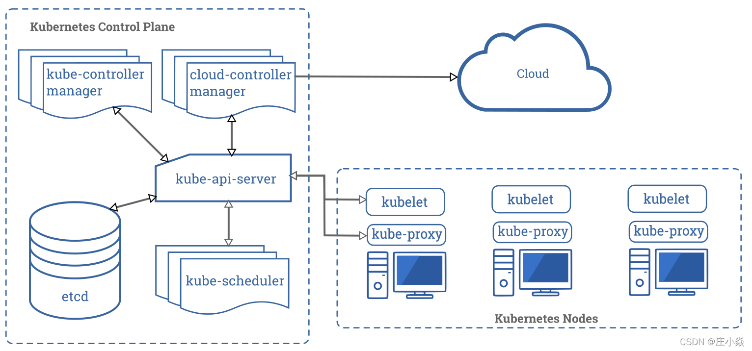 Kubernetes Cluster = N Master Node + N Worker Node:N主节点+N工作节点; N>=1。