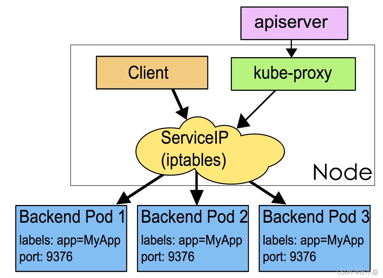 5.3.2 iptables mode 另一种mode是iptables,它完全利用内核iptables来实现service的代理和LB。是v1.2及之后版本默认模式,其原理图如下所示:
