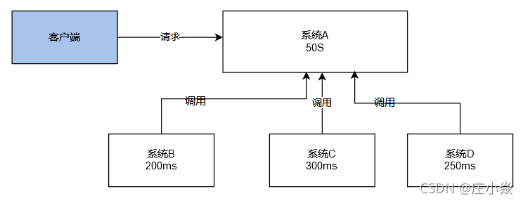 如图所示。一个客户端请求发送进来,系统A会调用系统B、C、D三个系统,同步请求的话,响应时间就是系统A、B、C、D的总和,也就是800ms。如果使用MQ,系统A发送数据到MQ,然后就可以返回响应给客户端,不需要再等待系统B、C、D的响应,可以大大地提高性能。对于一些非必要的业务,比如发送短信,发送邮件等等,就可以采用MQ。