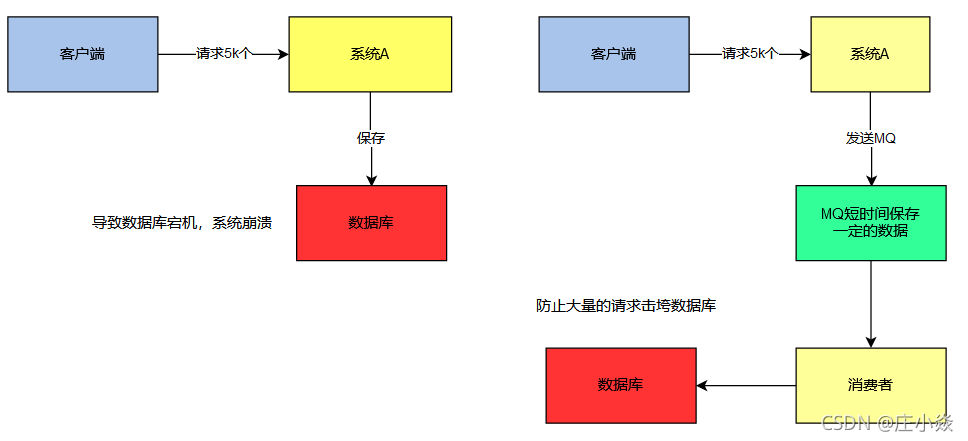 如图所示。这其实是MQ一个很重要的应用。假设系统A在某一段时间请求数暴增,有5000个请求发送过来,系统A这时就会发送5000条SQL进入MySQL进行执行,MySQL对于如此庞大的请求当然处理不过来,MySQL就会崩溃,导致系统瘫痪。如果使用MQ,系统A不再是直接发送SQL到数据库,而是把数据发送到MQ,MQ短时间积压数据是可以接受的,然后由消费者每次拉取2000条进行处理,防止在请求峰值时期大量的请求直接发送到MySQL导致系统崩溃。