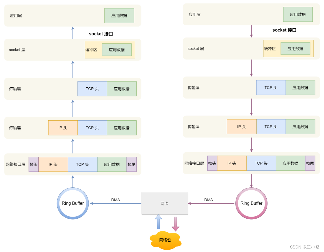 那软中断是怎么处理⽹络包的呢?它会从 Ring Buffer 中拷⻉数据到内核 struct sk_buff 缓冲区中,从⽽可以作为⼀个⽹络包交给⽹络协议栈进⾏逐层处理。