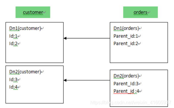 customer采用sharding-by-intfile这个分片策略,分片在dn1,dn2 上,orders依赖父表进行分片,两个表的关联关系为orders.customer_id=customer.id。于是数据分片和存储的示意图如下: