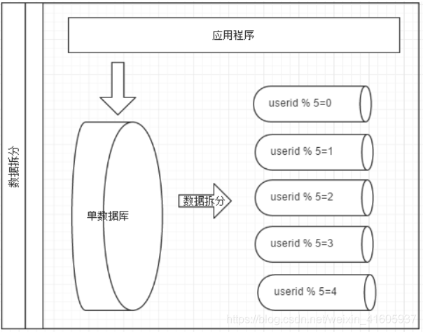 如图,切分原则都是根据业务找到适合的切分规则分散到不同的库,下面用用户ID求模举例: