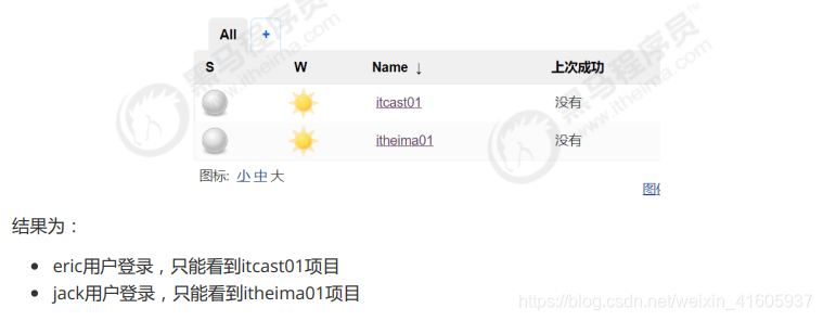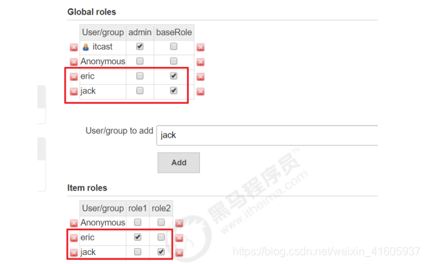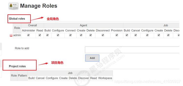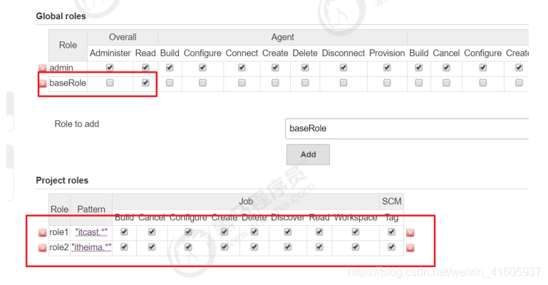 我们添加以下三个角色: baseRole:该角色为全局角色。这个角色需要绑定Overall下面的Read权限,是为了给所有用户绑定最基本的Jenkins访问权限。注意:如果不给后续用户绑定这个角色,会报错误:用户名 is missing the Overall/Read permission role1:该角色为项目角色。使用正则表达式绑定"itcast.*",意思是只能操作itcast开头的项目。 role2:该角色也为项目角色。绑定"itheima.*",意思是只能操作itheima开头的项目。·