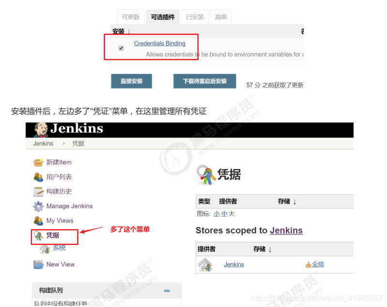 凭据可以用来存储需要密文保护的数据库密码、Gitlab密码信息、Docker私有仓库密码等,以便Jenkins可以和这些第三方的应用进行交互。安装Credentials Binding插件,要在Jenkins使用凭证管理功能,需要安装Credentials Binding插件