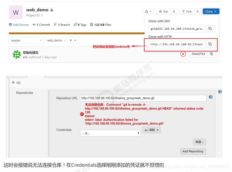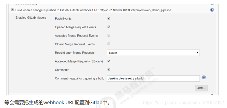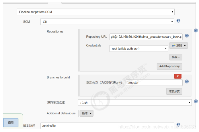 找到"源码管理"->"Git",在Repository URL复制Gitlab中的项目URL