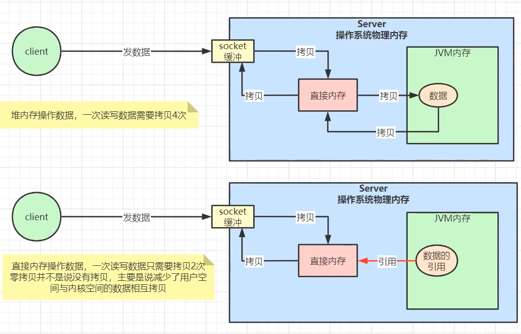 - 在某些场景下可以提升程序I/O操纵的性能。少去将数据从堆内内存拷贝到堆外内存的步骤。