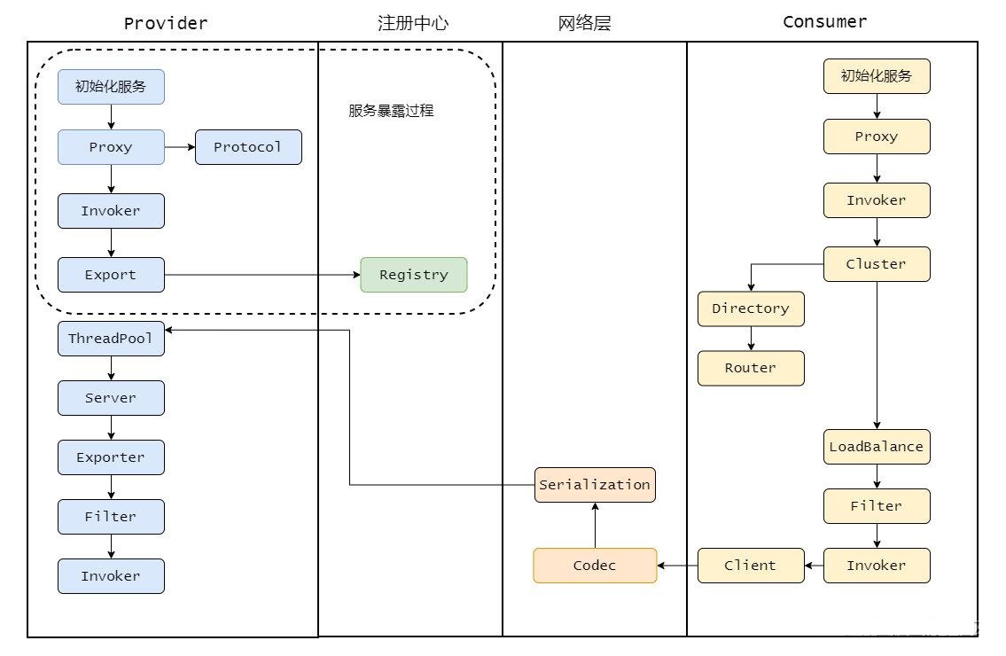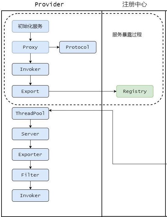 然后再通过 Exporter 包装一下,这是为了在注册中心暴露自己套的一层,然后将 Exporter 通过 Registry 注册到注册中心。 这就是整体服务暴露过程。