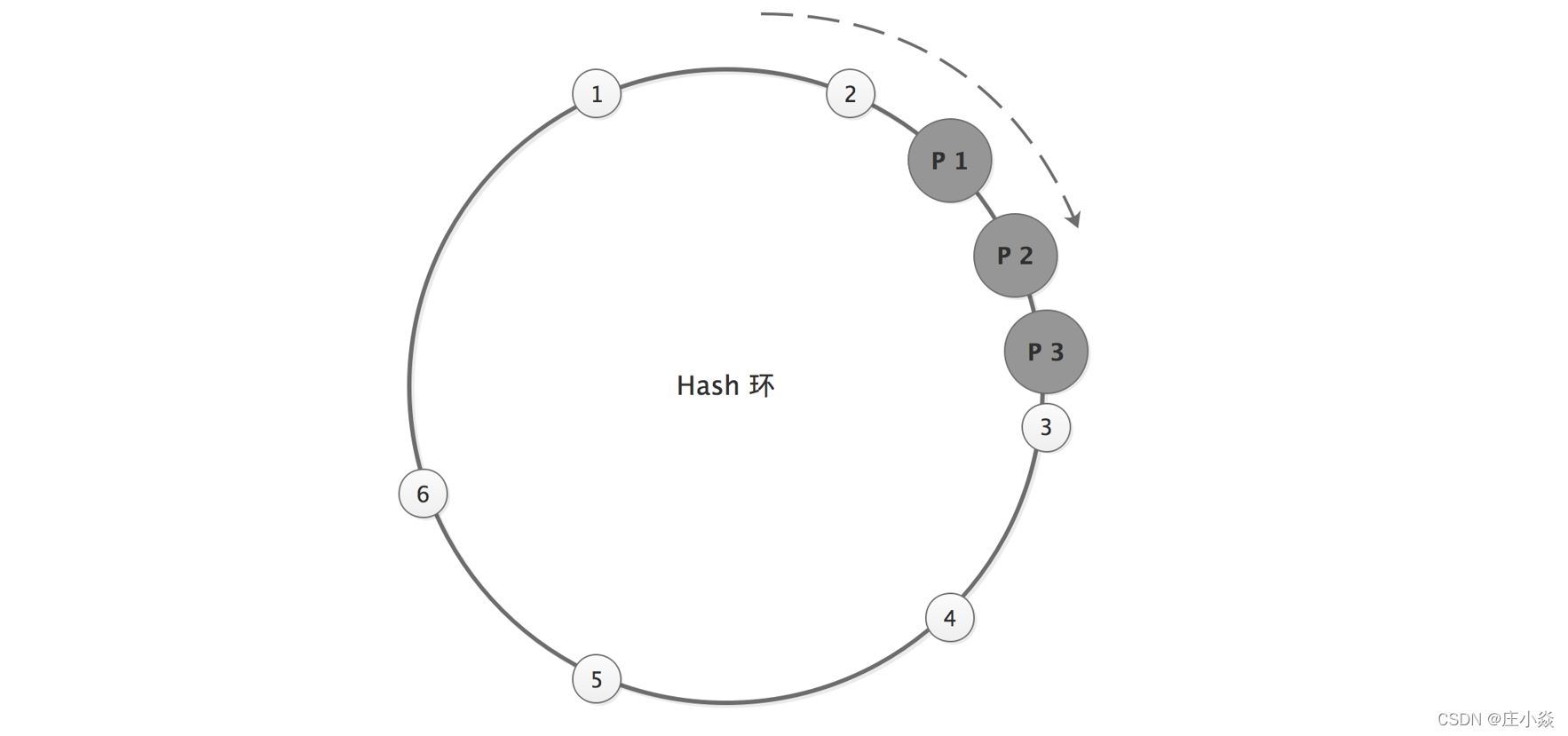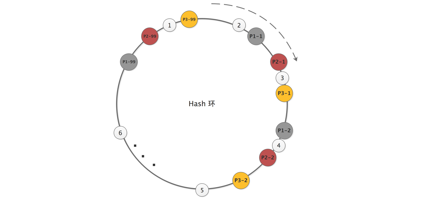 Hash 槽解决数据倾斜的思路是:既然问题是由 Provider 节点在 Hash 环上分布不均匀造成的,那么可以虚拟出 n 组 P1、P2、P3 的 Provider 节点 ,让多组 Provider 节点相对均匀地分布在 Hash 环上。如下图所示,相同阴影的节点均为同一个 Provider 节点,比如 P1-1、P1-2……P1-99 表示的都是 P1 这个 Provider 节点。引入 Provider 虚拟节点之后,让 Provider 在圆环上分散开来,以避免数据倾斜问题。