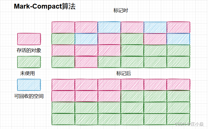 标记-压缩算法的最终效果等同于标记-清除算法执行完成后,再进行一次内存碎片整理,因此,也可以把它称为标记-清除-压缩(Mark-Sweep-Compact)算法。二者的本质差异在于标记-清除算法是一种非移动式的回收算法,标记-压缩是移动式的。是否移动回收后的存活对象是一项优缺点并存的风险决策。可以看到,标记的存活对象将会被整理,按照内存地址依次排列,而未被标记的内存会被清理掉。如此一来,当我们需要给新对象分配内存时,JVM 只需要持有一个内存的起始地址即可,这比维护一个空闲列表显然少了许多开销。