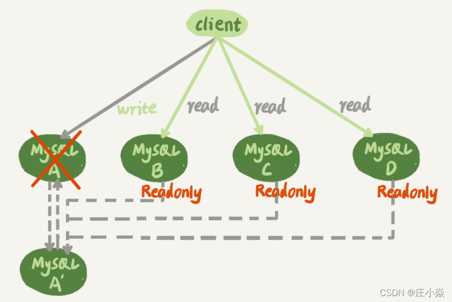 一、一主多从结构图中,虚线箭头表示的是主备关系,也就是 A 和 A’互为主备, 从库 B、C、D 指向的是主库 A。一主多从的设置,一般用于读写分离,主库负责所有的写入和一部分读,其他的读请求则由从库分担。在一主多从架构下,主库故障后的主备切换问题。图就是主库发生故障,主备切换后的结果。