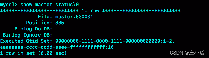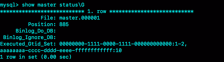 其中,前三条语句的作用,是通过提交一个空事务,把这个 GTID 加到实例 X 的 GTID 集合中。如图 5 所示,就是执行完这个空事务之后的 show master status 的结果。