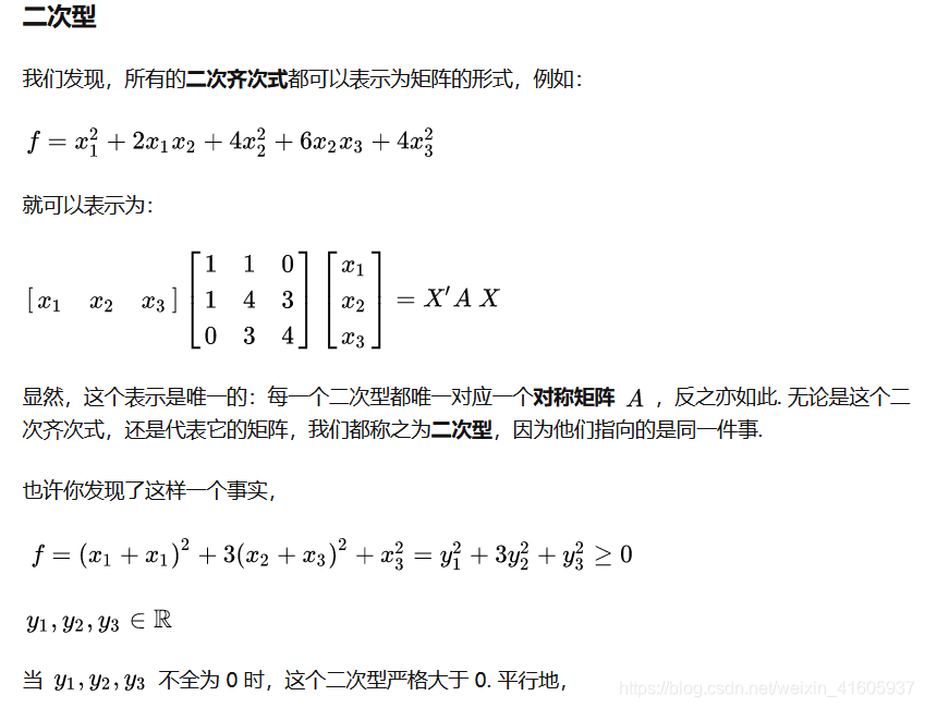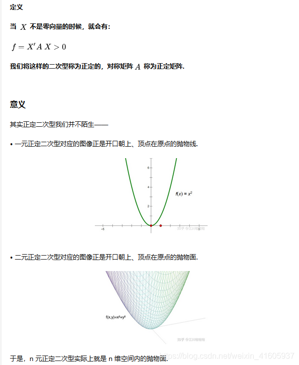 正定矩阵是研究二次型(二次齐次多项式)时所提出的,前提矩阵必须是Hermite矩阵。随便找本线性代数书,都有各种公式。矩阵正定说明其表示的二次曲面位于底面上方,相反,矩阵负定说明其表示的二次曲面位于底面下方。通过引进Hessian矩阵,还可以确定其极值点。矩阵正定性在概率论,凸优化等课程的应用中起了很大作用,