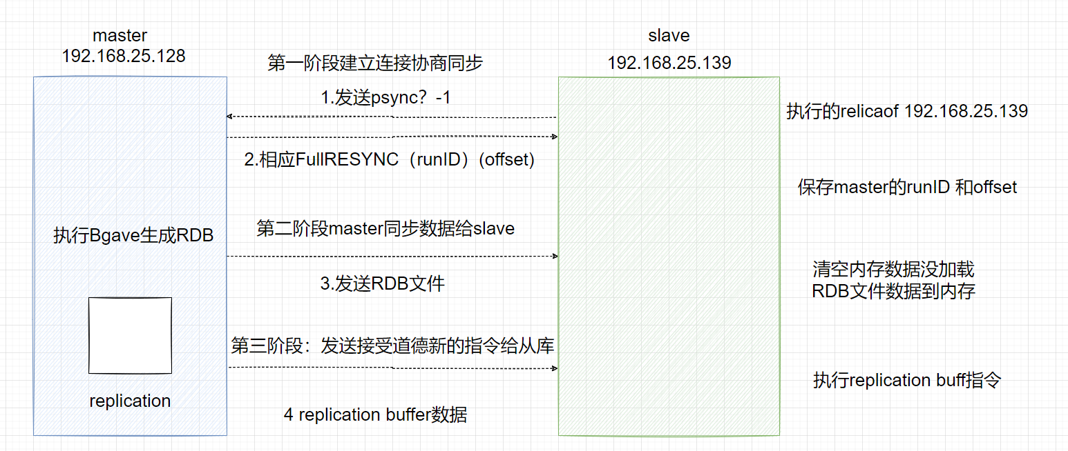 该阶段的主要作用是在主从节点之间建立连接,为数据全量同步做好准备。从库会和主库建立连接,从库执行 replicaof 并发送 psync 命令并告诉主库即将进行同步,主库确认回复后,主从库间就开始同步了。在从节点的配置文件中的 replicaof 配置项中配置了主节点的 IP 和 port 后,从节点就知道自己要和那个主节点进行连接了。从节点内部维护了两个字段,masterhost 和 masterport,用于存储主节点的 IP 和 port 信息。从库执行 replicaof 并发送 psync 命令,表示要执行数据同步,主库收到命令后根据参数启动复制。命令包含了主库的 runID 和 复制进度 offset 两个参数。
