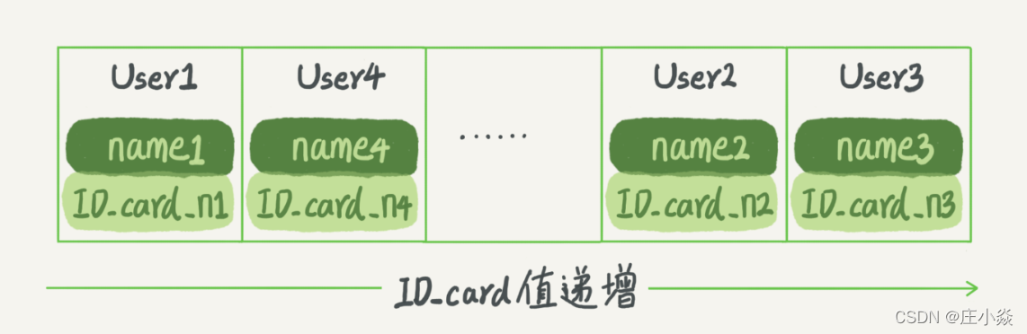 同时很显然,这个索引结构支持范围查询。你要查身份证号在 [ID_card_X, ID_card_Y] 区间的 User,可以先用二分法找到 ID_card_X(如果不存在 ID_card_X,就找到大于 ID_card_X 的第一个 User),然后向右遍历,直到查到第一个大于 ID_card_Y 的身份证号,退出循环。