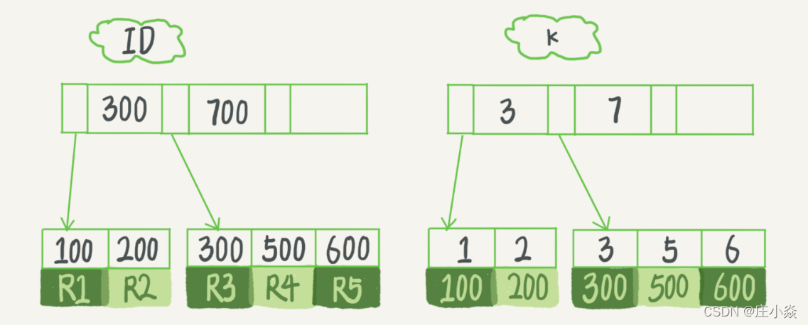 - 在 k 索引树上找到 k=3 的记录,取得 ID = 300;