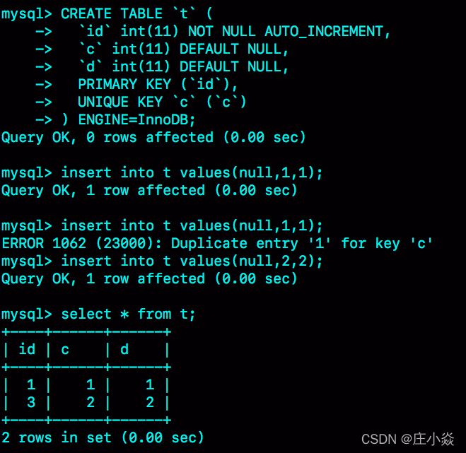 - 继续执行插入数据操作,由于已经存在 c=1 的记录,所以报 Duplicate key error,语句返回。