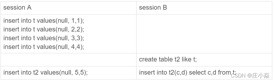 在这个例子里,我往表 t1 中插入了 4 行数据,然后创建了一个相同结构的表 t2,然后两个 session 同时执行向表 t2 中插入数据的操作。