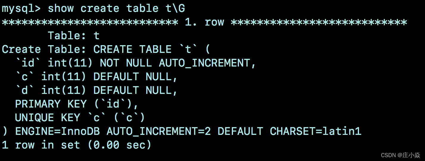 可以看到,表定义里面出现了一个 AUTO_INCREMENT=2,表示下一次插入数据时,如果需要自动生成自增值,会生成 id=2。其实,这个输出结果容易引起这样的误解:自增值是保存在表结构定义里的。实际上,表的结构定义存放在后缀名为.frm 的文件中,但是并不会保存自增值。