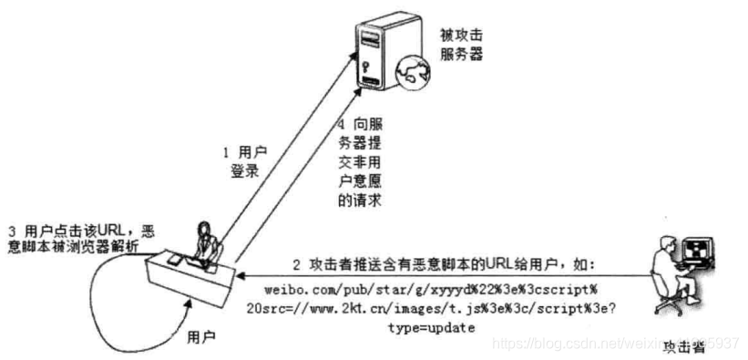 常见的XSS 攻击类型有两种,一种是反射型,攻击者诱使用户点击一个嵌入恶意脚本的链接,达到攻击的目的。上文提到的新浪微博攻击就是一种反射型XSS 攻击。攻击者发布的微博中有一个含有恶意脚本的URL(在实际应用中,该脚本在攻击者自己的服务器www.2kt.cn,URL 中包含脚本的链接),用户点击该URL,脚本会自动关注攻击者的新浪微博ID,发布含有恶意脚本URL的微博,攻击就被扩散了。这次攻击还只是一次恶作剧而已,现实中,攻击者可以采用XSS攻击,偷取用户Cookie、密码等重要数据,进而伪造交易、盗窃用户财产、窃取情报。