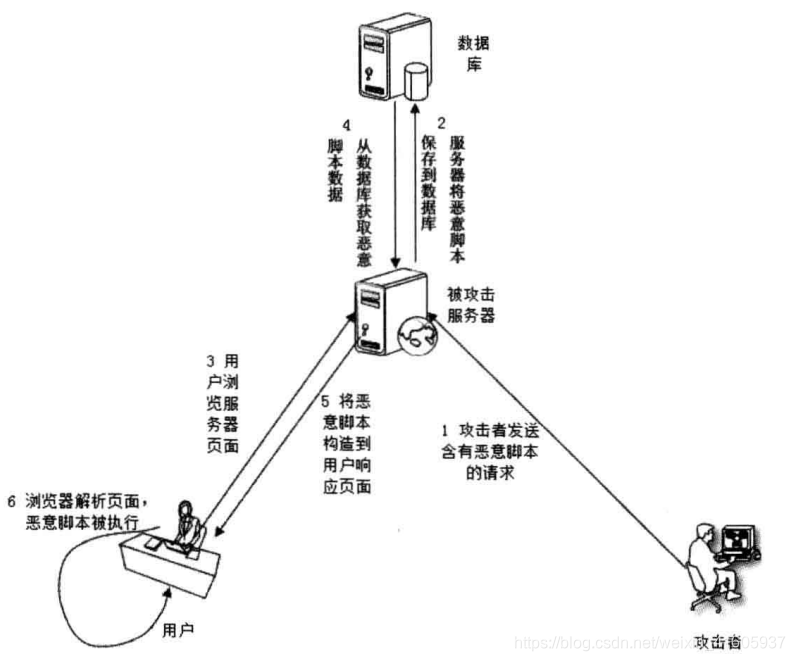 另外一种XSS攻击是持久型XSS攻击,黑客提交含有恶意脚本的请求,保存在被攻击的Web站点的数据库中,用户浏览网页时,恶意脚本被包含在正常页面中,达到攻击的目的。此种攻击经常使用在论坛,博客等Web应用中。