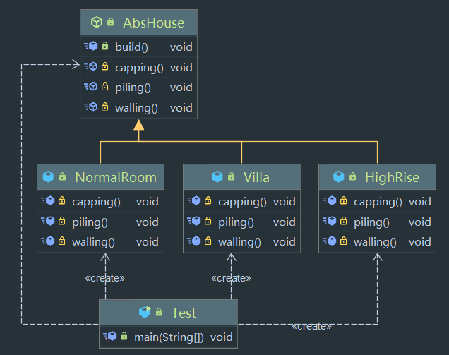 - 2)设计的程序结构,过于简单,没有设计缓存层对象,程序的扩展和维护不好。也就是说,这种设计方案把产品(即:房子)和创建产品的过程(即:建房子流程)封装在一起,耦合性增强了。