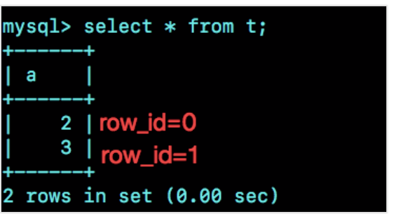 可以看到,在我用 gdb 将 dict_sys.row_id 设置为 2^48之后,再插入的 a=2 的行会出现在表 t 的第一行,因为这个值的 row_id=0。之后再插入的 a=3 的行,由于 row_id=1,就覆盖了之前 a=1 的行,因为 a=1 这一行的 row_id 也是 1。