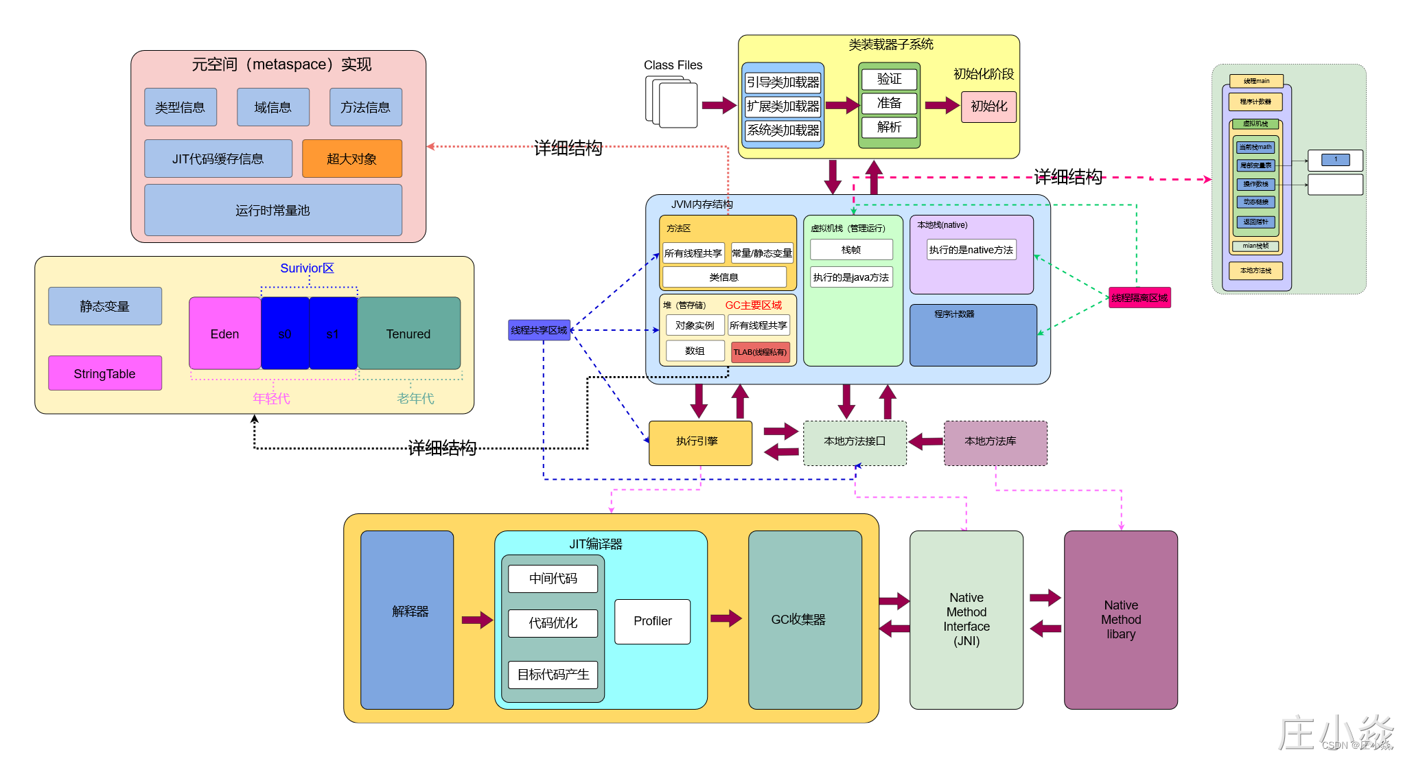 - JDK8后,元空间替换了永久代,元空间使用的是本地内存,还有其它细节变化:字符串常量由永久代转移到堆中,和永久代相关的JVM参数已移除.