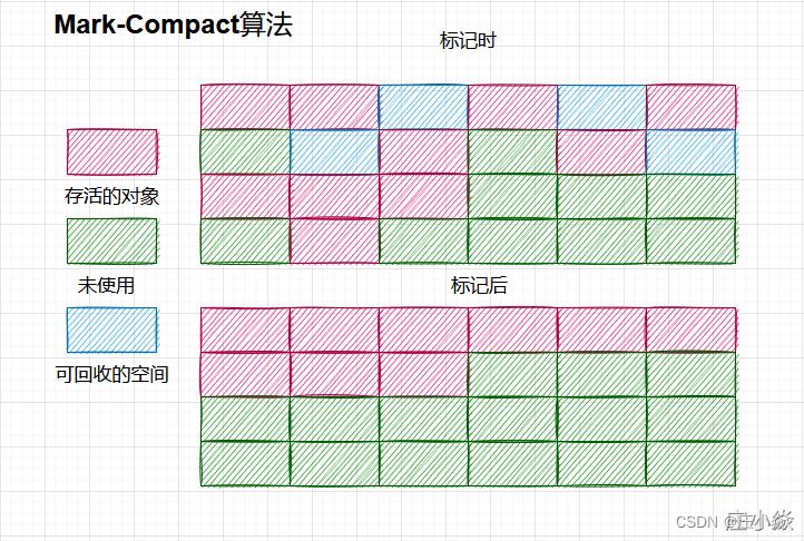 - 为对象分配内存空间: 此时,对象所属类已经加载,现在需要在堆内存中为该对象分配一定的空间,该空间的大小在类加载完成时就已经确定下来了。为对象分配内存空间有两种方式: