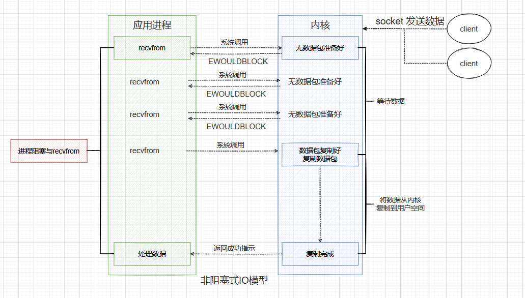 同步非阻塞就是每次隔一定时间进行轮询(polling)方式检查。在这种模型中,设备是以非阻塞的形式打开的。这意味着 IO 操作不会立即完成,read 操作可能会返回一个错误代码,说明这个命令不能立即满足(EAGAIN 或 EWOULDBLOCK)。