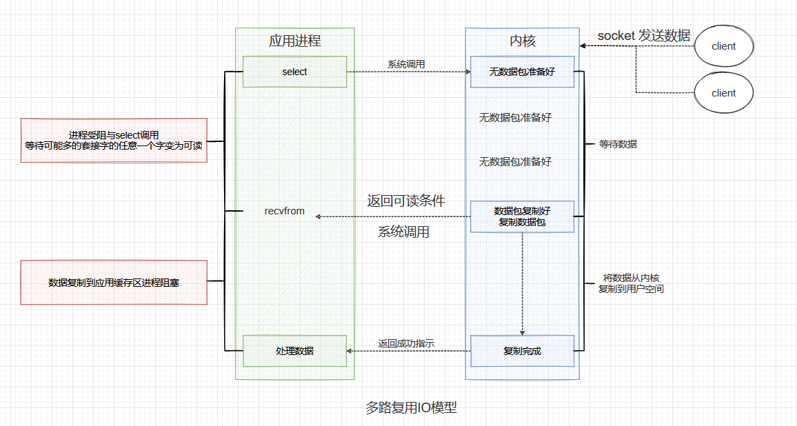 当用户进程调用了select,那么整个进程会被block,而同时,kernel会“监视”所有select负责的socket,当任何一个socket中的数据准备好了,select就会返回。这个时候用户进程再调用read操作,将数据从kernel拷贝到用户进程。
