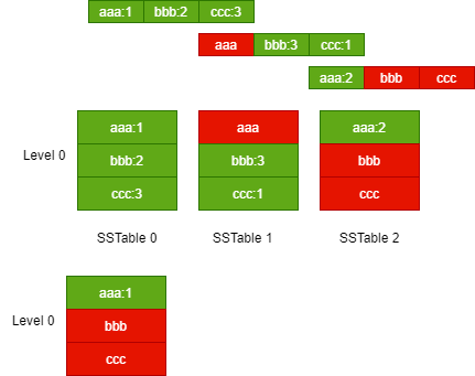 当一层的 SSTable 文件总大小大于阈值时,或者 SSTable 文件的数量太多时,就需要触发合并动作,生成新的 SSTable 文件,放入下一层中,再将原先的 SSTable 文件删除,下图演示了这一过程。