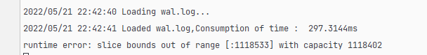 2022/05/21 21:59:30 Loading wal.log...2022/05/21 21:59:32 Loaded wal.log,Consumption of time : 1.8237905s2022/05/21 21:59:32 Loading database...2022/05/21 21:59:32 The SSTable list are being loaded2022/05/21 21:59:32 Loading the E:\项目\lsm数据测试目录/1.0.db2022/05/21 21:59:32 Loading the E:\项目\lsm数据测试目录/1.0.db ,Consumption of time : 92.9994ms2022/05/21 21:59:32 Loading the E:\项目\lsm数据测试目录/1.1.db2022/05/21 21:59:32 Loading the E:\项目\lsm数据测试目录/1.1.db ,Consumption of time : 65.9812ms2022/05/21 21:59:32 Loading the E:\项目\lsm数据测试目录/2.0.db2022/05/21 21:59:32 Loading the E:\项目\lsm数据测试目录/2.0.db ,Consumption of time : 331.6327ms2022/05/21 21:59:32 The SSTable list are being loaded,consumption of time : 490.6133ms