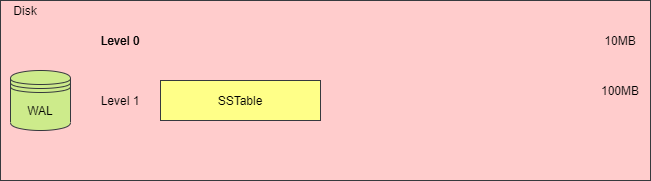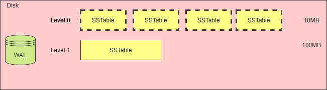 每一层的 SSTable 文件大小之和,是根据第 0 层生成的,例如,当你设置第 0 层为 1MB 时,第 1 层则为 10MB,第 2 层则为 100 MB,使用者只需要设置第 0 层的文件总大小阈值即可。