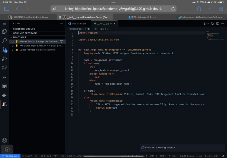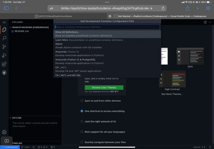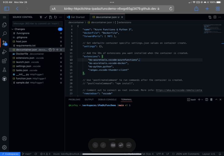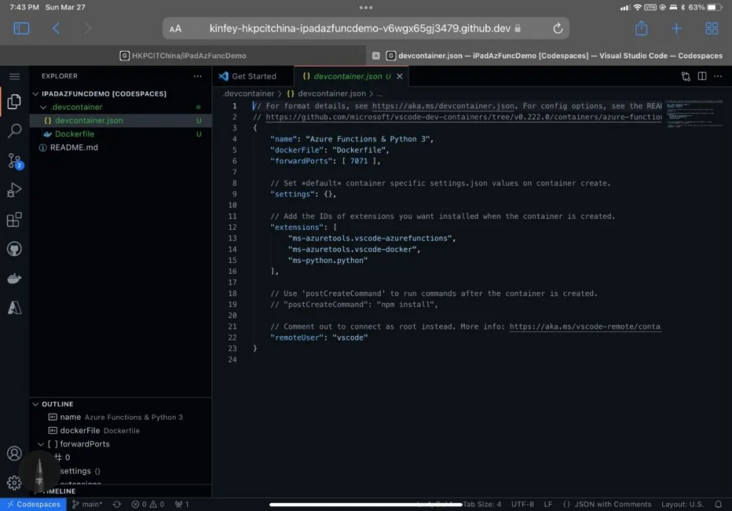 devcontainer.json 是 Codespace 下设定的开发环境配置,除了对应的 Dockefile 外,还包括开发需要到的端⼝,设定,以及对应的 Visual Studio Code 插件安装。像我这⾥就有开发的 Docker 端⼝,以及 Python/Docker/Azure Functions 等插件。这个配置环境对于多⼈开发的项⽬是⾮常有⽤的,因为新的开发⼈员不⽤再关⼼开发环境如何配置,节约了配置时间