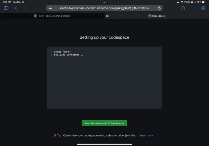 1.⾸先打开我的 iPad Safari 浏览器,访问我的⼀个 GitHub Repository,选择Code 按钮,再选择Codespaces 标签点击 New Codespaces,你就可以启动⼀个基于该 Repo 下的 Codespaces 环境