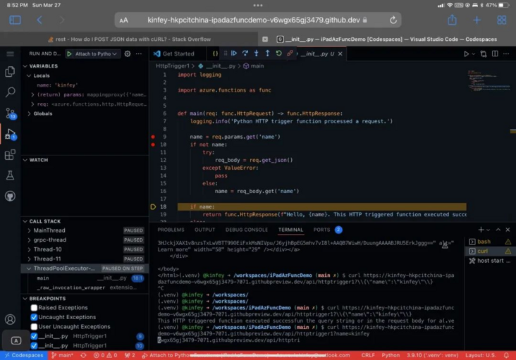 5.来谈谈调试,可以直接进⾏调试,就如本地应⽤⼀样,⾮常⽅便