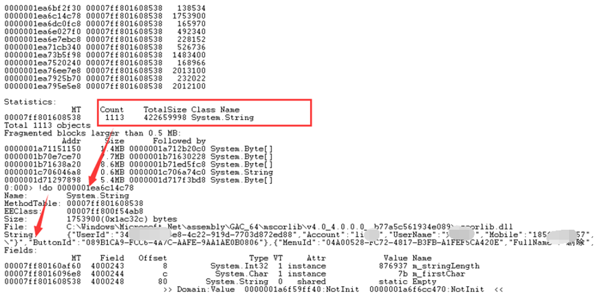 如果某一类或者几类对象的内存总占用很多,分析此类对象 !dumpheap –mt *** -stat。