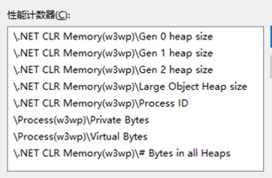Process/Private Bytes Process/Virtual Bytes .NET CLR Memory/# Bytes in all Heaps : CLR内存托管堆的大小 .NET CLR Memory/Large Object Heap Size: 大对象堆包含其大小为 85,000 个字节和更多字节的对象。