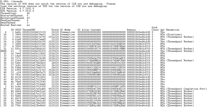 0:000> !threadpoolCPU utilization: 2%Worker Thread: Total: 19 Running: 2 Idle: 17 MaxLimit: 32767 MinLimit: 4Work Request in Queue: 0--------------------------------------Number of Timers: 2--------------------------------------Completion Port Thread:Total: 4 Free: 4 MaxFree: 8 CurrentLimit: 4 MaxLimit: 1000 MinLimit: 4