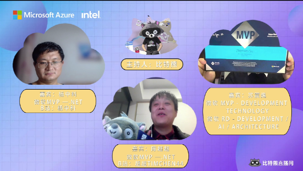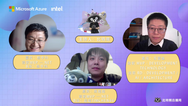 虽然比特熊与三位老师都还是网友关系,但通过线上交流已经很熟悉了。杨中科老师是比特熊眼中的视频分享高产大户,视频内容不仅有技术还有学英语等等,连B站给他的标注都是B站知名Up主。第一次知道陈超超老师是在参加微软MVP线上会议的时候,超超老师不仅讲了自己的技术长项还大方推荐自己喜欢的游戏,让比特熊眼前一亮!比特熊还关注了超超老师在微软Reactor分享的 “进击吧!Blazor!”系列,在开发者圈子里很受欢迎,获得了超高的点击量!我们title很长的苏震巍老师,不仅是Development Technology方向的MVP,还是我们微软的RD。相信有不少伙伴跟比特熊一样也经常在社区活动中见到过苏老师,也有幸听过他的分享。
