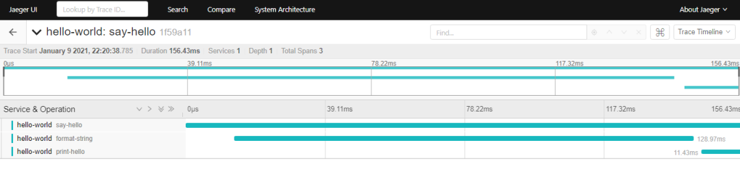 分别启动 Web 和 控制台程序,然后打开 Jaeger 界面,在 ”Service“ 中选择 hello-world,然后点击底下的 Find Traces。