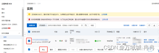 方法一:找到阿里云服务器控制台实例页面,选中要安装宝塔的实例,点停止,