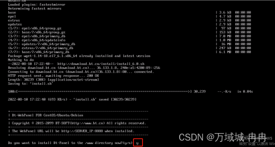 连接上之后输入宝塔安装命令:yum install -y wget && wget -O install.sh http://download.bt.cn/install/install_6.0.sh && sh install.sh,输完后,按下回车