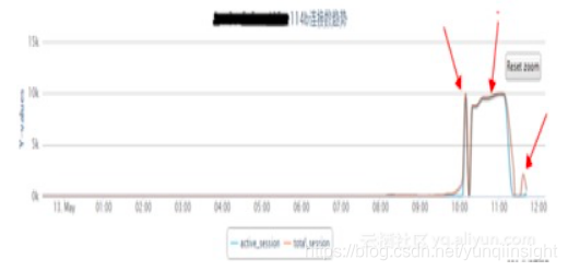 是“秒杀”场景开始的时候,可以看到连接数成指数级变化,瞬间增加了10倍