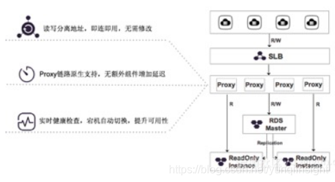 链路访问 在链路访问方面,我们提供更高安全性的数据库代理访问模式,用户可以根据需要随时开启或关闭。数据库代理的规格大小由RDS系统自动管理,可以在保证租户间资源隔离的前提下,根据负载大小自适应调节。数据库代理对应用透明无感知,也无需人工干预,大大降低了运维成本。 如下图所示